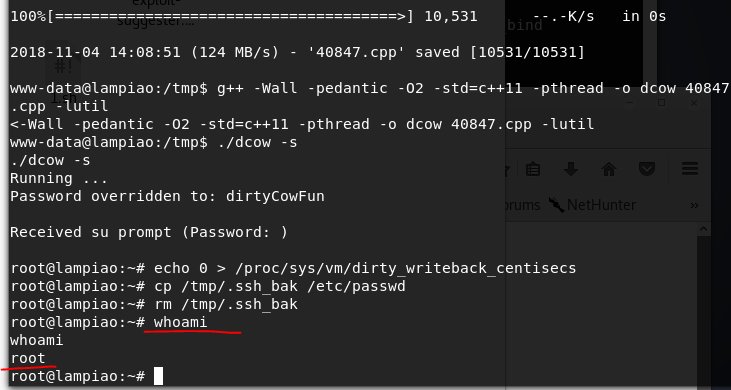 dirty cow,exp :https://www.exploit-db.com/download/40847.cpp