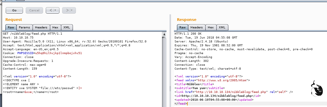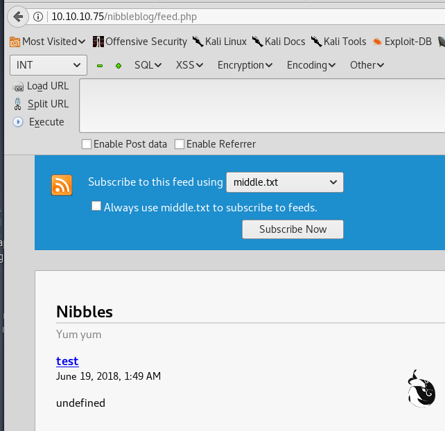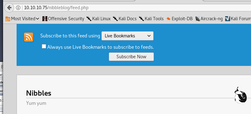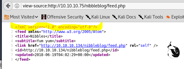 在feed.php源码,http://10.10.10.75/nibbleblog/feed.php