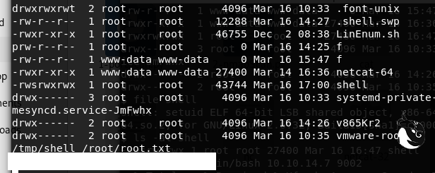 稍等片刻,约一分钟左右,该文件为suid权限。 运行该文件,即可以root权限查看/root/root.txt