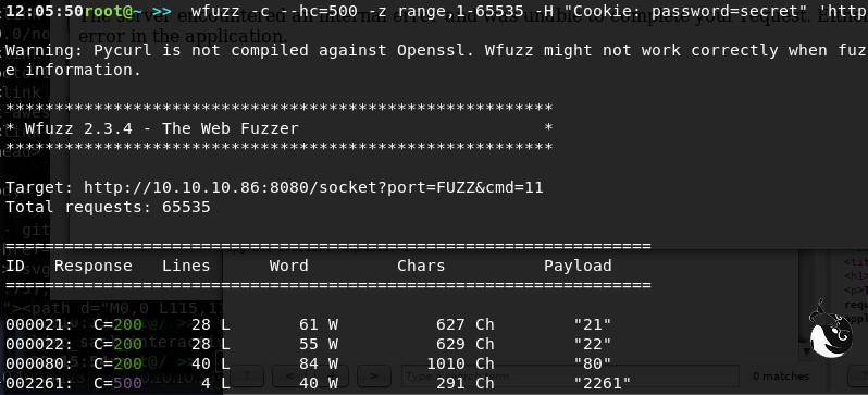 wfuzz -c --hc=500 -z range,1 -65535 -H "Cookie: password=secret" 'http://10.10.10.86:8080 /socket?port=FUZZ&cmd=11 '