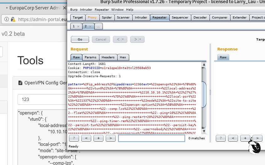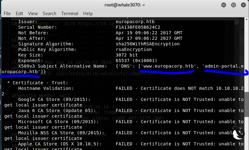 | X509v3 Subject Alternative Name: {'DNS': ['www.europacorp.htb', 'admin-portal.europacorp.htb']} echo 10.10.10.22 admin-portal.europacorp.htb >> /etc/hosts echo 10.10.10.22 www.europacorp.htb >> /etc/hosts echo 10.10.10.22 europacorp.htb >> /etc/hosts