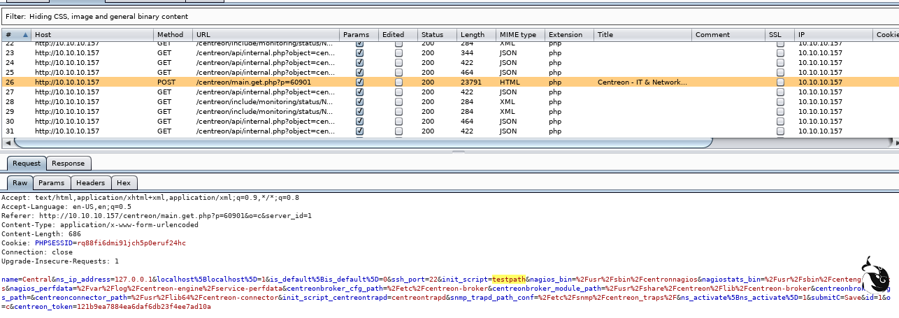 开启burp,首先访问http://10.10.10.157/centreon/main.php?p=60901&o=c&server_id=1