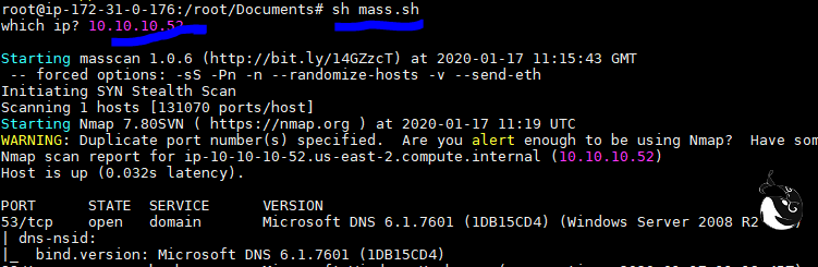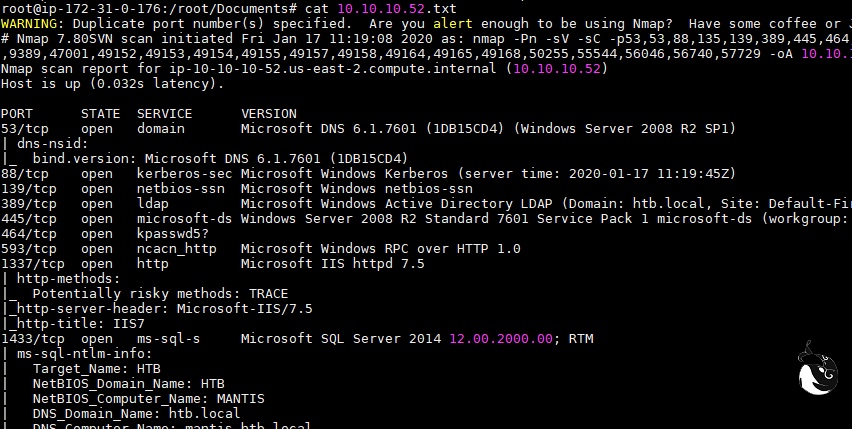 53/tcp open domain Microsoft DNS 6.1.7601 (1DB15CD4) (Windows Server 2008 R2 SP1) | dns-nsid: |_ bind.version: Microsoft DNS 6.1.7601 (1DB15CD4) 88/tcp open kerberos-sec Microsoft Windows Kerberos (server time:2020-01-1711:19:45Z) 139/tcp open netbios-ssn Microsoft Windows netbios-ssn 389/tcp open ldap Microsoft Windows Active Directory LDAP (Domain: htb.local, Site: Default-First-Site-Name) 445/tcp open microsoft-ds Windows Server 2008 R2 Standard 7601 Service Pack 1 microsoft-ds (workgroup: HTB) 464/tcp open kpasswd5? 593/tcp open ncacn_http Microsoft Windows RPC over HTTP 1.0 1337/tcp open http Microsoft IIS httpd 7.5 | http-methods: |_ Potentially risky methods: TRACE |_http-server-header: Microsoft-IIS/7.5 |_http-title: IIS7 1433/tcp open ms-sql-s Microsoft SQL Server 201412.00.2000.00; RTM | ms-sql-ntlm-info: | Target_Name: HTB | NetBIOS_Domain_Name: HTB | NetBIOS_Computer_Name: MANTIS | DNS_Domain_Name: htb.local | DNS_Computer_Name: mantis.htb.local | DNS_Tree_Name: htb.local |_ Product_Version:6.1.7601 | ssl-cert:Subject: commonName=SSL_Self_Signed_Fallback | Not valid before:2020-01-17T09:04:27 |_Not valid after:2050-01-17T09:04:27 |_ssl-date:2020-01-17T11:20:51+00:00; +31s from scanner time. 3268/tcp open ldap Microsoft Windows Active Directory LDAP (Domain: htb.local, Site: Default-First-Site-Name) 8080/tcp open http Microsoft HTTPAPI httpd 2.0 (SSDP/UPnP) |_http-open-proxy: Proxy might be redirecting requests |_http-server-header: Microsoft-IIS/7.5 |_http-title: Tossed Salad - Blog 9389/tcp open mc-nmf .NET Message Framing 47001/tcp open http Microsoft HTTPAPI httpd 2.0 (SSDP/UPnP) |_http-server-header: Microsoft-HTTPAPI/2.0 |_http-title: Not Found 49157/tcp open ncacn_http Microsoft Windows RPC over HTTP 1.0 50255/tcp open ms-sql-s Microsoft SQL Server 201412.00.2000 | ms-sql-ntlm-info: | Target_Name: HTB | NetBIOS_Domain_Name: HTB | NetBIOS_Computer_Name: MANTIS | DNS_Domain_Name: htb.local | DNS_Computer_Name: mantis.htb.local | DNS_Tree_Name: htb.local |_ Product_Version:6.1.7601 | ssl-cert:Subject: commonName=SSL_Self_Signed_Fallback | Not valid before:2020-01-17T09:04:27 |_Not valid after:2050-01-17T09:04:27 |_ssl-date:2020-01-17T11:20:51+00:00; +31s from scanner time. Service Info:Host: MANTIS; OS: Windows; CPE: cpe:/o:microsoft:windows_server_2008:r2:sp1, cpe:/o:microsoft:windows