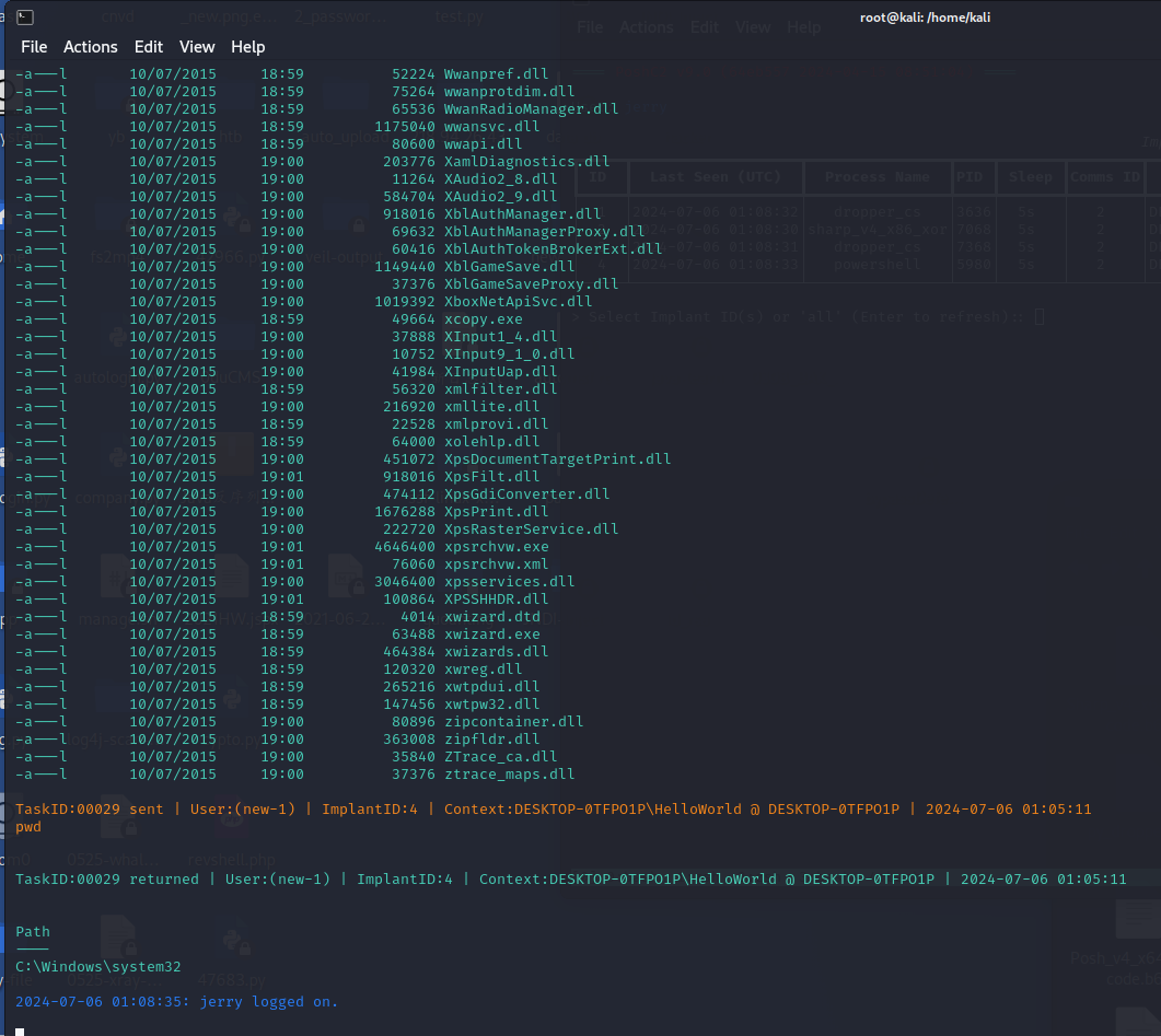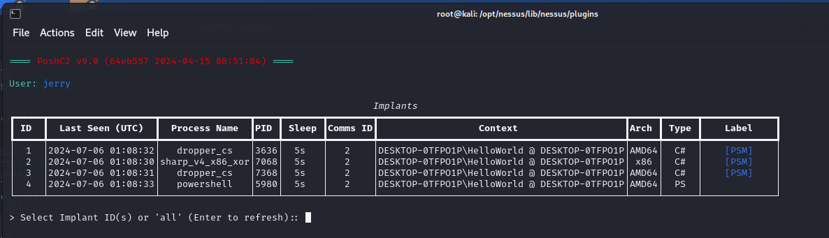 注意,执行的命令回显都会在posh-server那个团队服务器的终端进行显示。