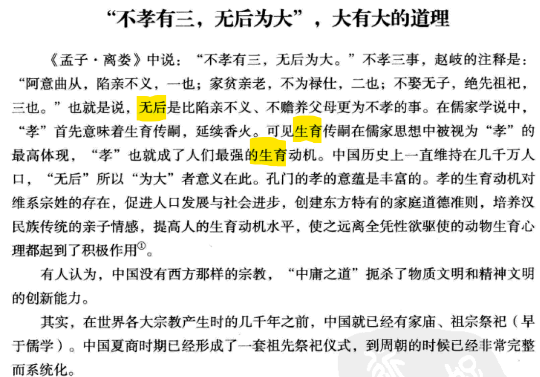 在第九章中,易富贤说“不孝有三,无后为大”。把无后翻译为了没有后代。