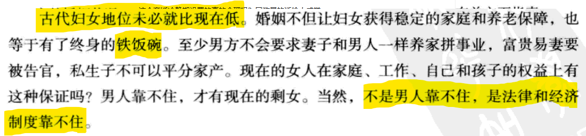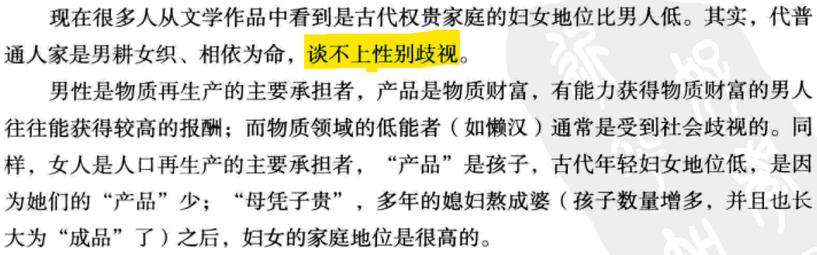 “古代妇女地位未必就比现在低”,意思就是古代比现代这方面做得更好,这句话等于否定了毛泽东的一系列”妇女能顶半边天“等等政策、否定了我党几十年的工作成果。我国之所以妇女地位变得这么高,就是因为推翻了封建主义。