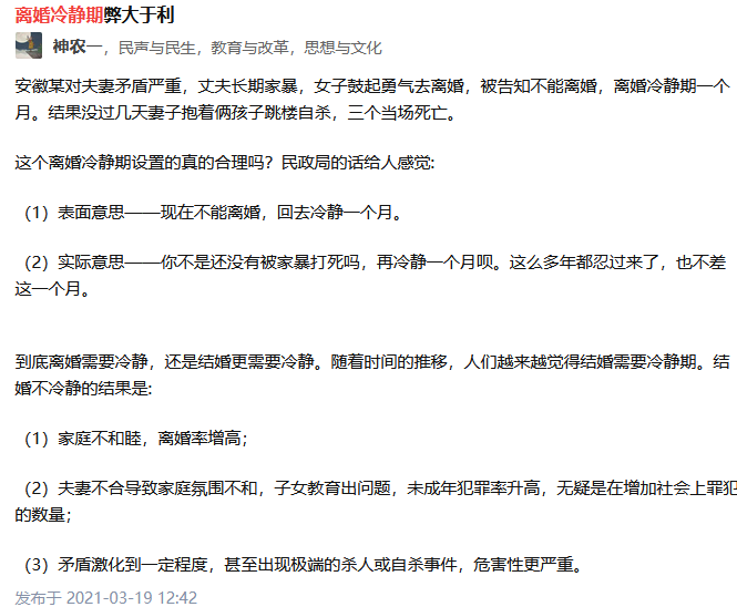 离婚冷静期到底保护哪些人的利益? - 异人嬴政的回答 - 知乎 https://www.zhihu.com/question/398792050/answer/1645709764