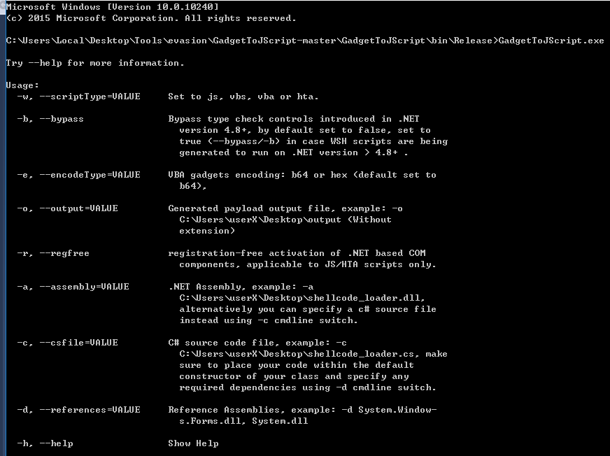 DotNetToJScript.exe ExampleAssembly.dll –lang=Jscript –ver=v4,v2 -o runner.js