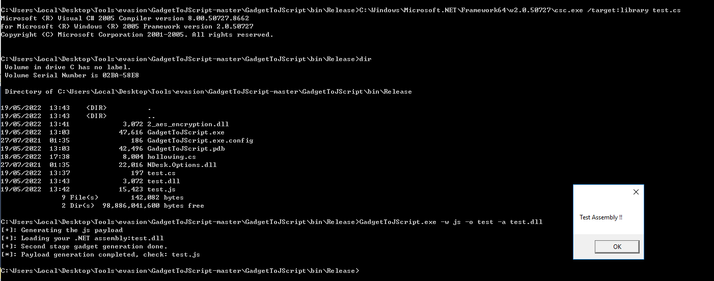GadgetToJScript.exe -w js -o test -a test.dll