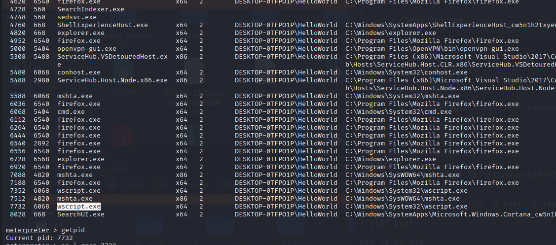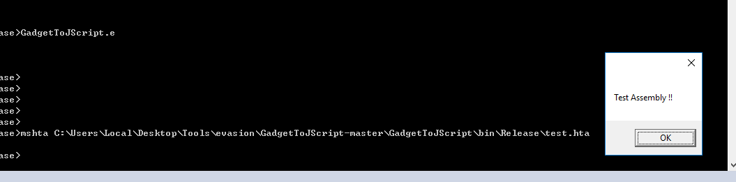 mshta C:\Users\Local\Desktop\Tools\evasion\GadgetToJScript-master\GadgetToJScript\bin\Release\test.hta