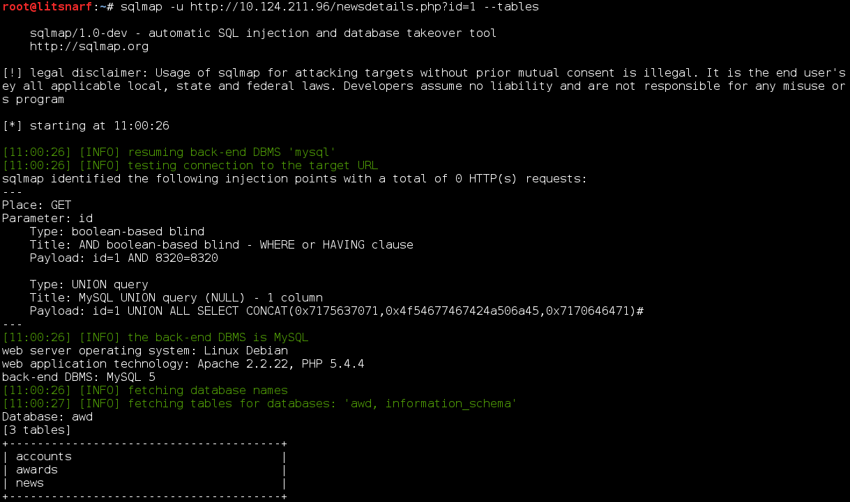从前面的截图中可以看到,sqlmap 将该参数标识为 易受攻击!现在我们只需要获取数据库的结构并导出数据。首先,让我们获取表的列表,如下所示: