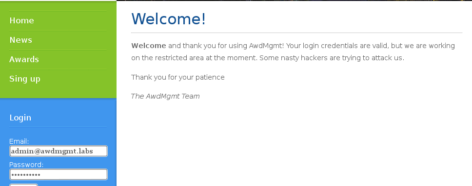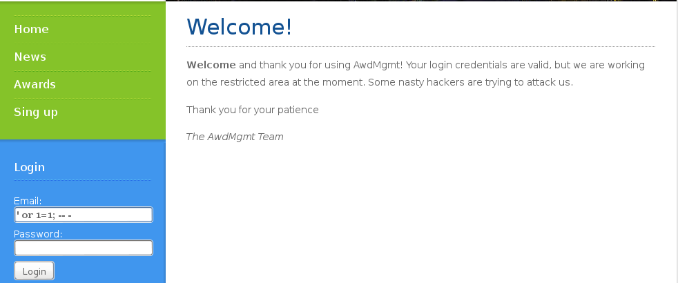 正如我们所看到的,登录表单也存在漏洞,实际上出现了 “Welcome!“ 消息!