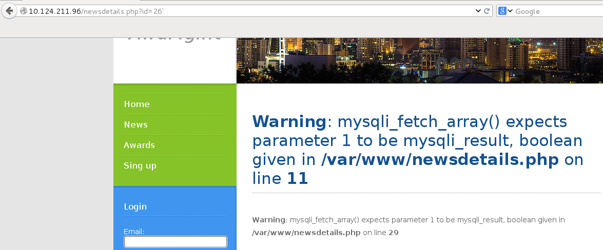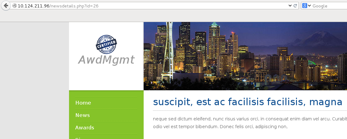 如果我们继续深入应用程序,我们可以看到以下地址的一个非常有趣的页面:http://10.124.211.96/news.php。