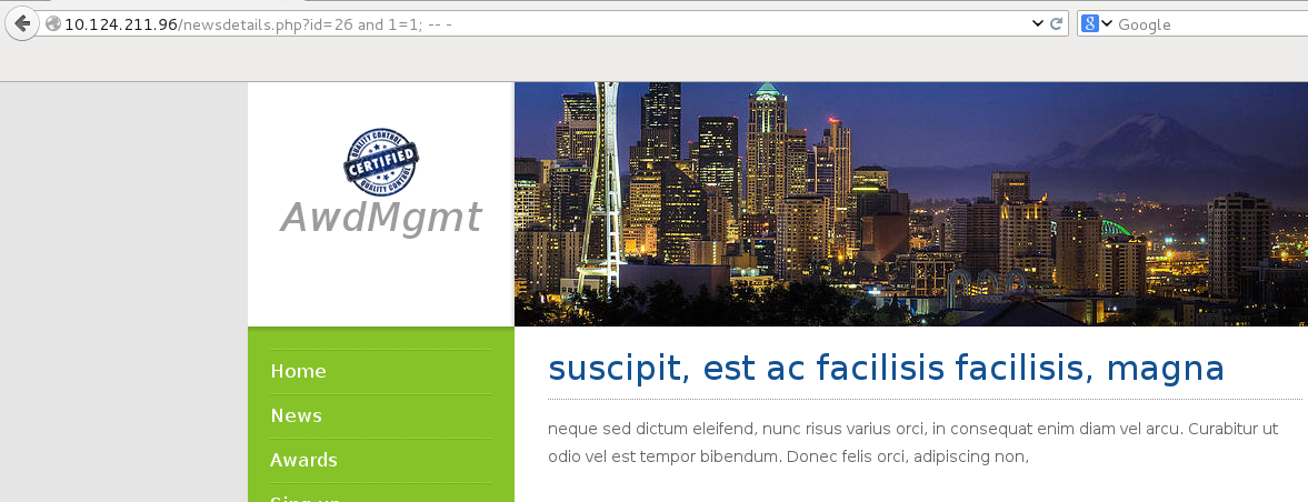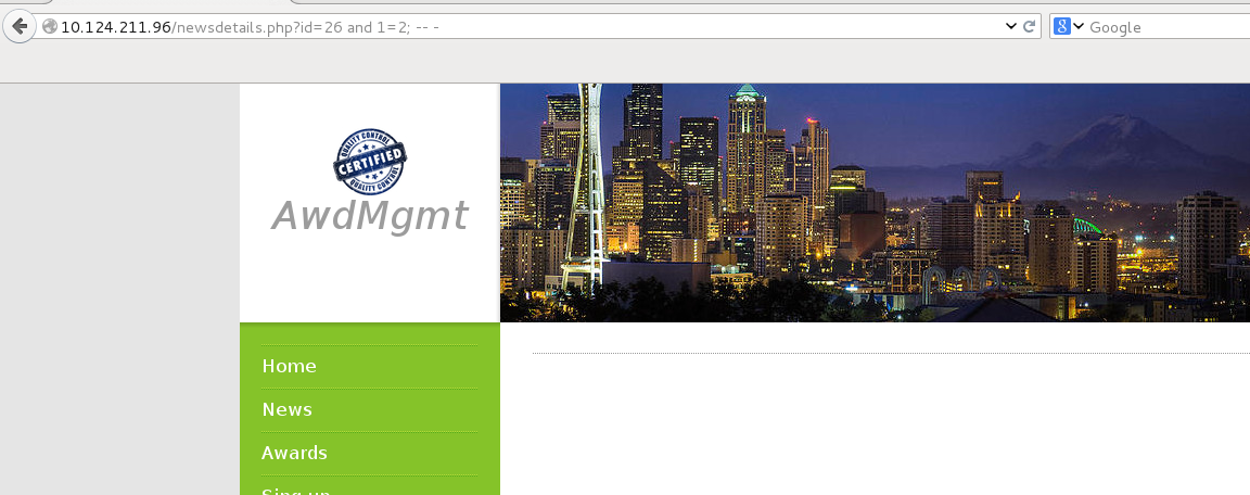 从前面两个截图中可以看到,我们获得了两个不同的结果。当条件为真时,应用程序返回新闻。当条件为假时,页面不返回任何内容。这意味着该参数容易受到 SQL 注入攻击!