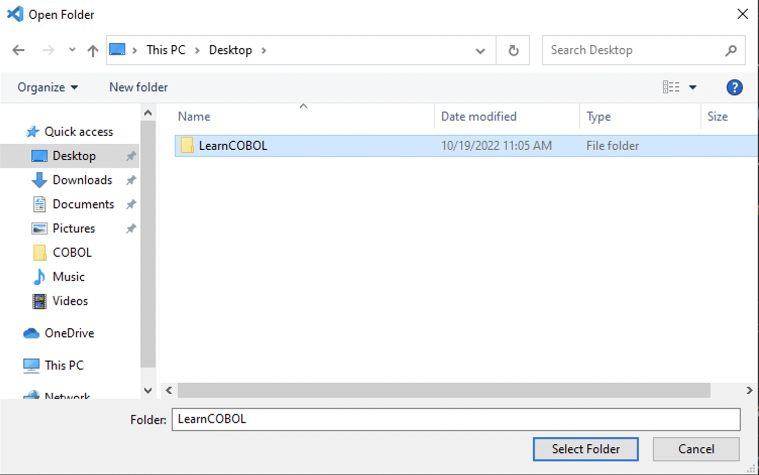 请注意,每次连接到系统时,都需要打开 LearnCOBOL 文件夹,重复步骤 5 到 7。要使您的连接配置文件在计算机的任何位置都可访问,您需要将配置文件 (即