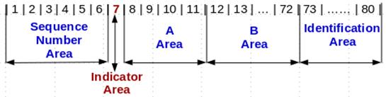 COBOL 源代码遵循一种基于列的结构,这意味着特定的列具有明确定义的用途,并且必须严格遵守规则。每行 COBOL 源代码都包含五个区域,每个区域都有起始列和结束列。