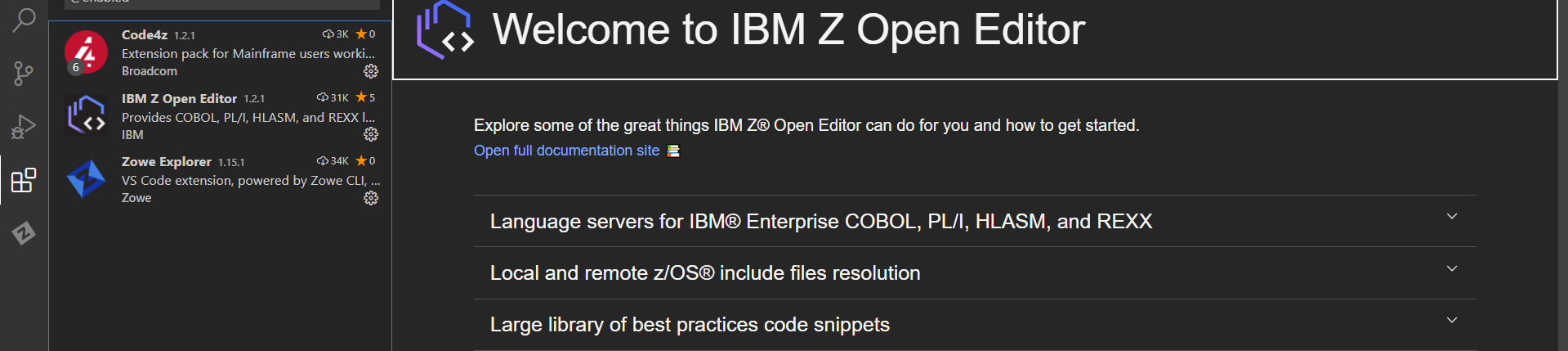 单击 扩展 图标。如果您安装了 IBM Z Open Editor 和 Zowe Explorer,则列表中应包括以下内容: