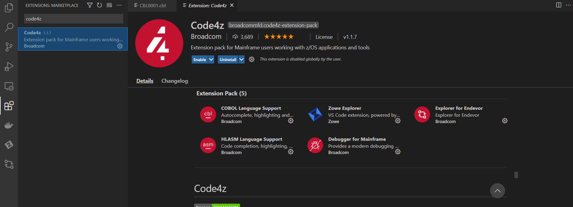 注意: 如果您的列表同时包含 Z Open Editor 和 COBOL 语言支持,请禁用其中一个,方法是点击扩展列表中扩展旁边的 齿轮 图标,然后选择 禁用。