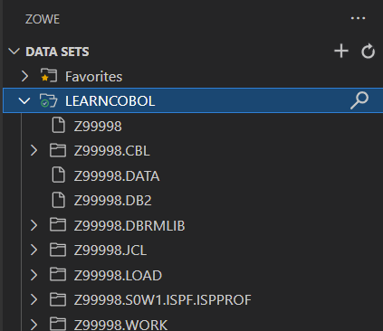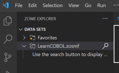 展开 LearnCOBOL,显示“使用搜索按钮显示数据集”。单击放大镜图标,如图 14 所示。