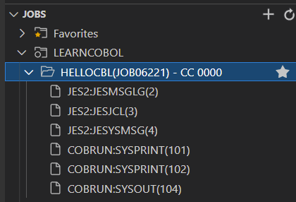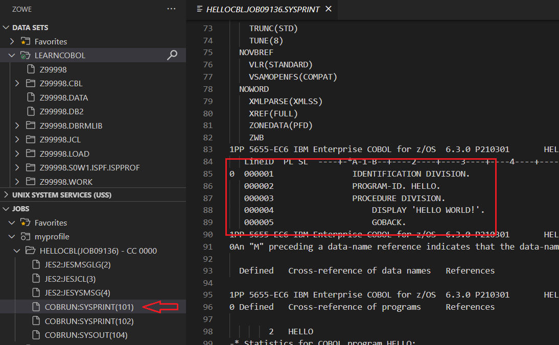 通过从 Zowe Explorer 的 LEARNCOBOL 中的 Jobs 部分选择 COBRUN:SYSOUT(104) 查看 COBOL 程序的执行,如图 25 所示。