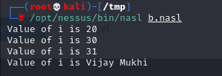 每种语言都允许使用变量。在 NASL 中,无需创建变量,只需使用它即可。因此,我们创建了一个变量 i 并将其设置为 20。显示函数显示其值。请记住,nasl 不会评估双引号中的任何内容,包括变量名。+ 运算符将其值增加 10,然后使用 ++ 将变量的值增加 1。最后,我们做了一件不可思议的事情,我们将变量 i 的值设置为字符串。nasl 根本没有抱怨。因此,在 nasl 中我们不会声明或定义变量,我们只是使用它。变量的数据类型可以在程序中途更改。Nasl 处理所有内部事务。