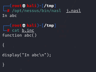 由于 abc 函数未定义,因此我们得到一个错误。拥有函数的整个想法就是重用该代码块。但是,将函数放在 nasl 文件中会破坏共享的想法。因此,将所有函数代码放在 inc 文件中是明智的。我们创建 b.inc 作为
