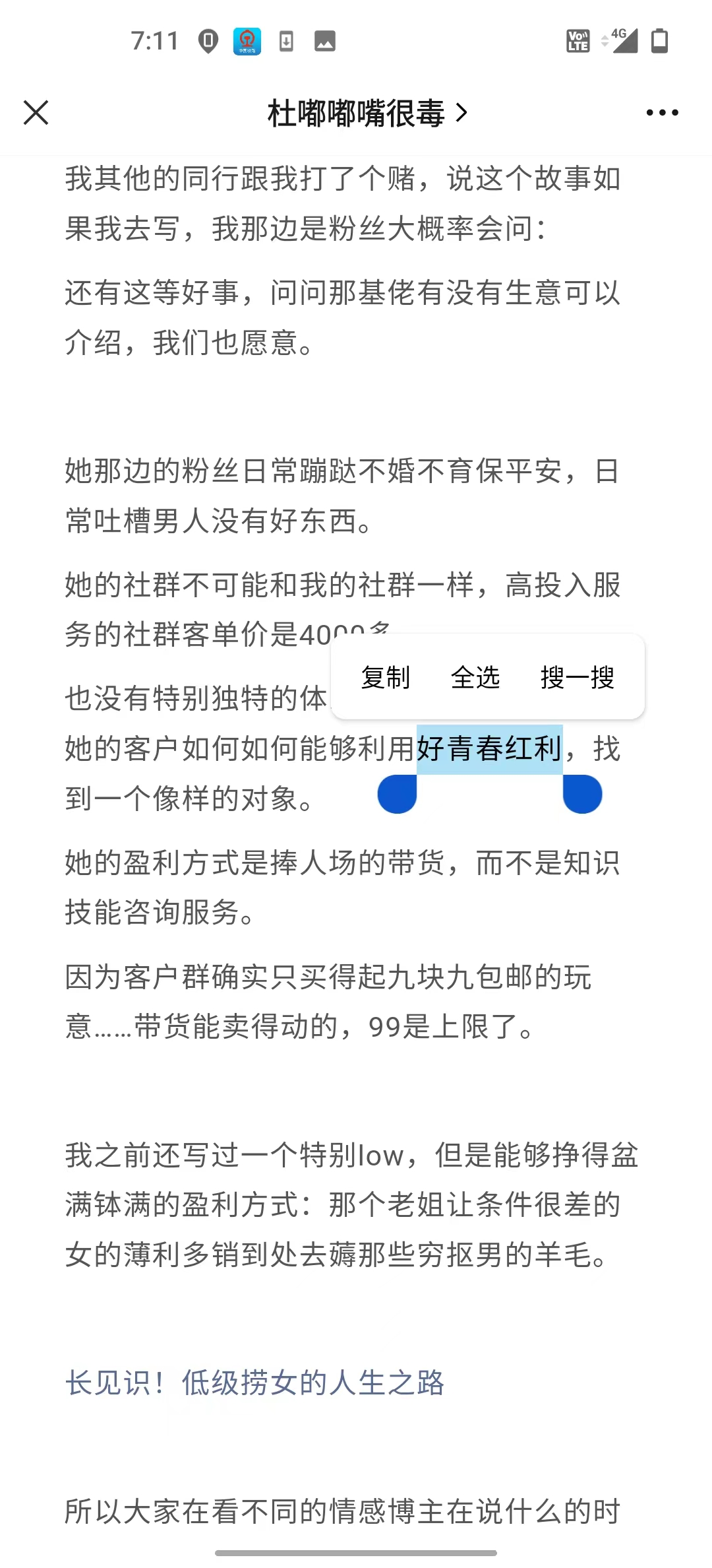 她的社群不可能和我的社群一样,高投入服务的社群客单价是4000多,也没有特别独特的体系,可以很细致地教会她的客户如何如何能够利用好青春红利,找到一个像样的对象。
