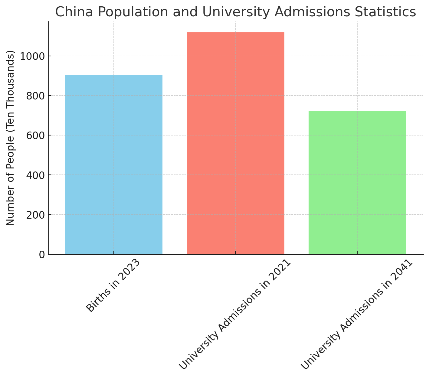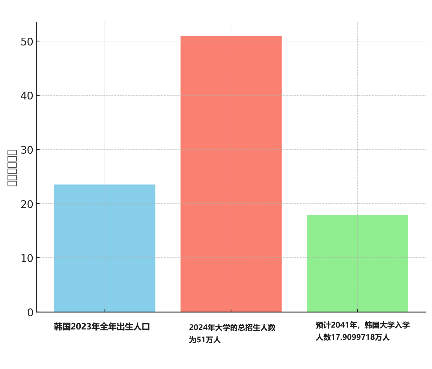 大学的总招生人数为51万人,而出生人口只有23.5万人。也就是说在招生比例不变的情况下,