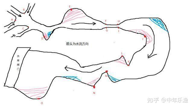 图中FGHI应了一句宽钓窄,此处是鱼儿必经鱼路,钓窄抓鱼路,也是不错的钓点。图中LM均为桦尖,鱼儿顺水流过基本上都会经过此地。所以是个好钓位。图中粉色的地方均为回湾水流慢了一点,鱼儿稍事休息怕地方,也是很好钓的。蓝色为水流直接冲击的地方。鱼儿不傻,不会在此地和水流搏斗的。