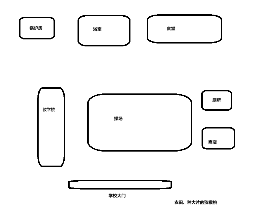 那个学校有教学楼、操场、食堂、厕所、垃圾场、浴室、宿舍等等。以下是我根据回忆画的地图。