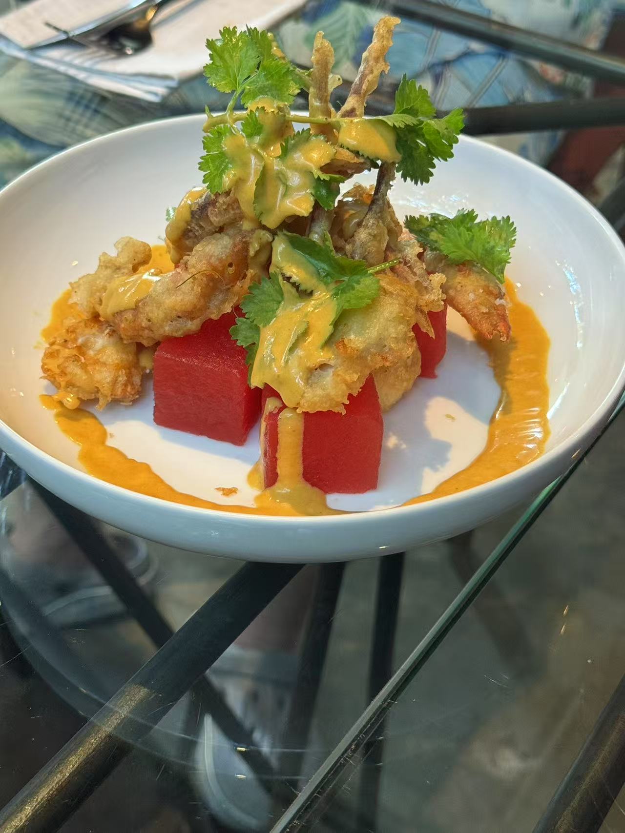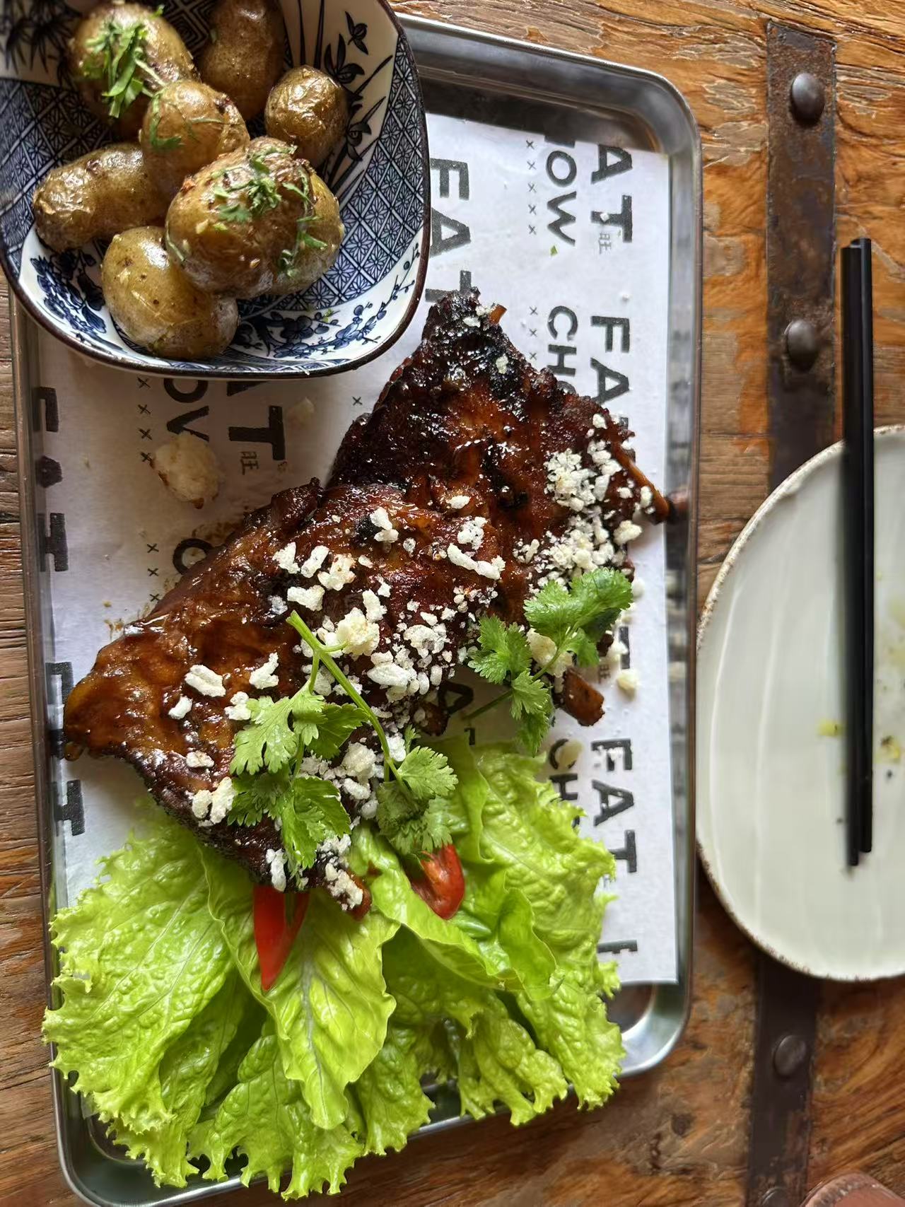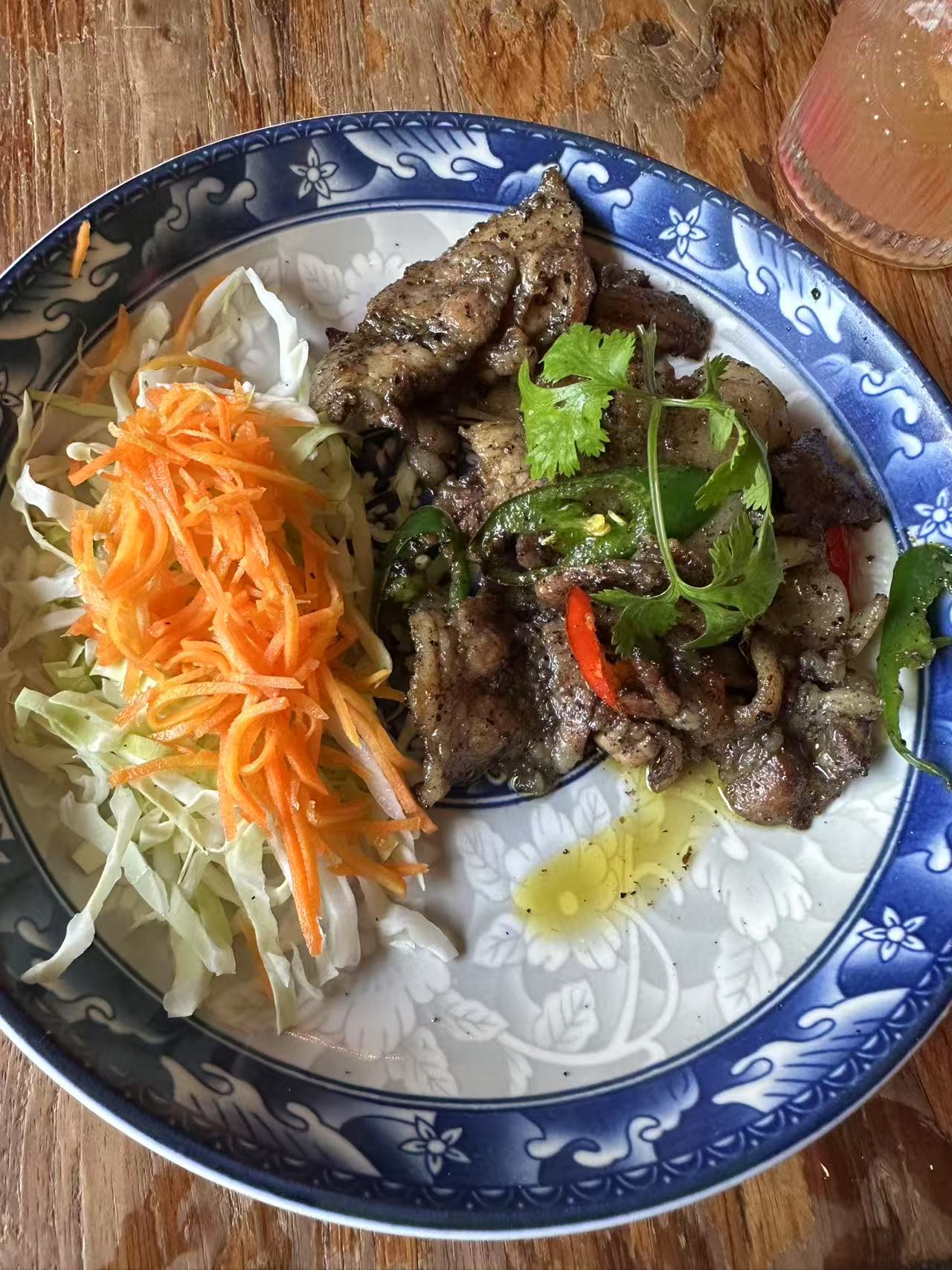 中午吃的是脏鸭餐,味道很棒。个人比较挑食,我全都吃完了。 烤鸭脆脆的,酱料是酸辣的。