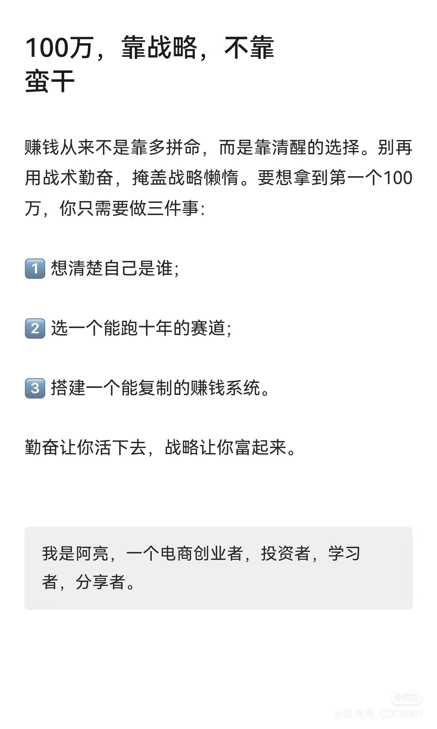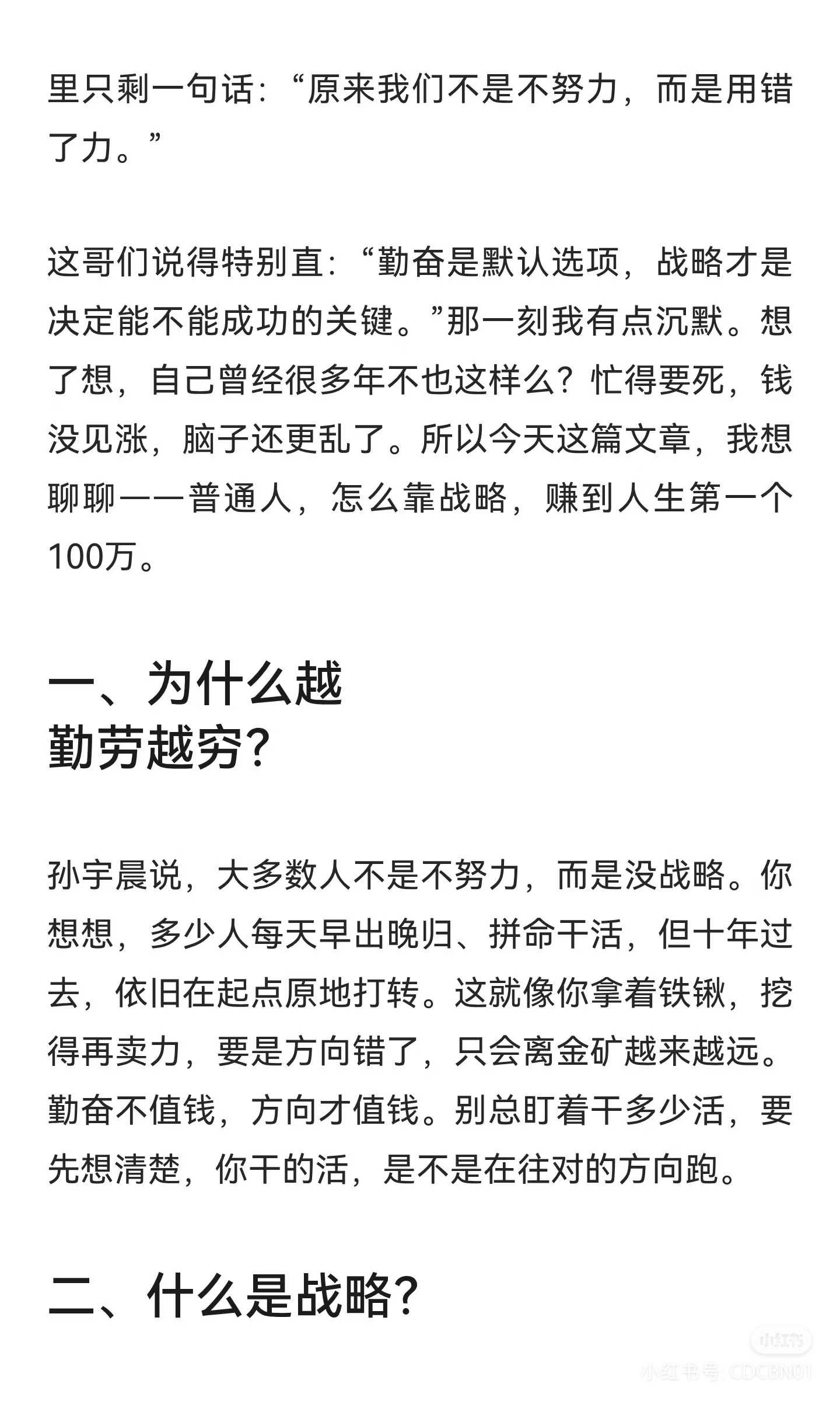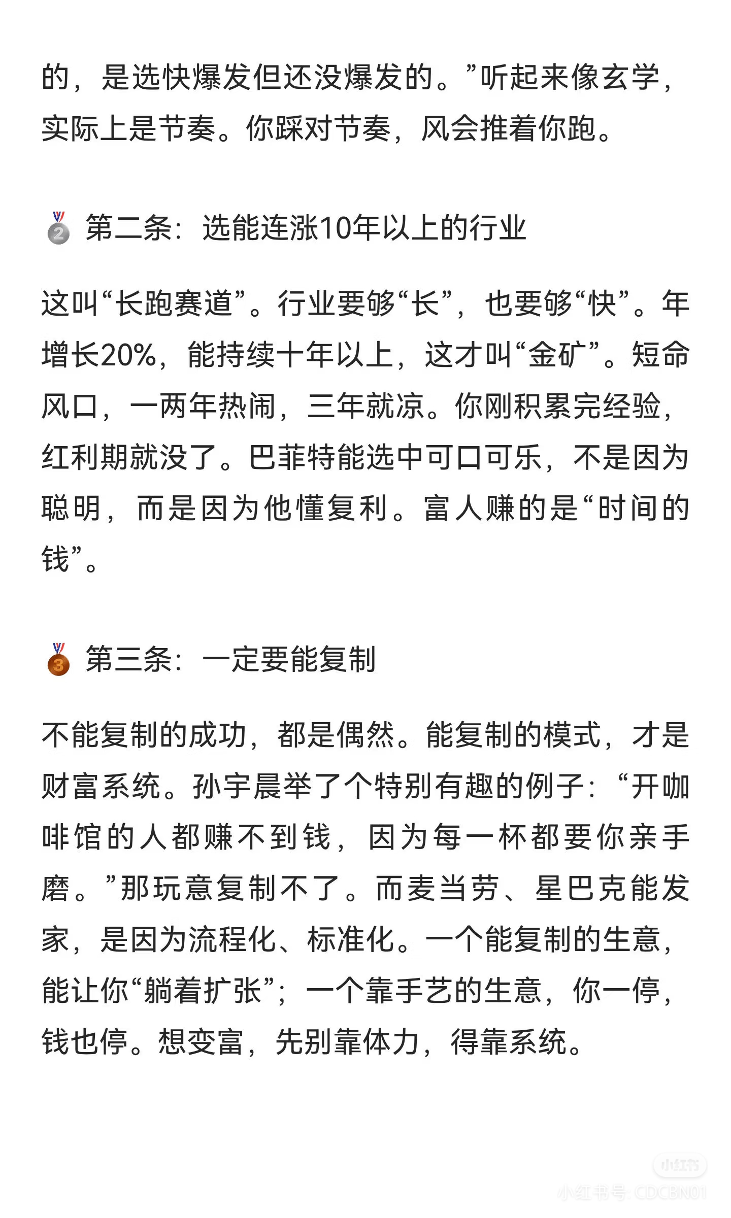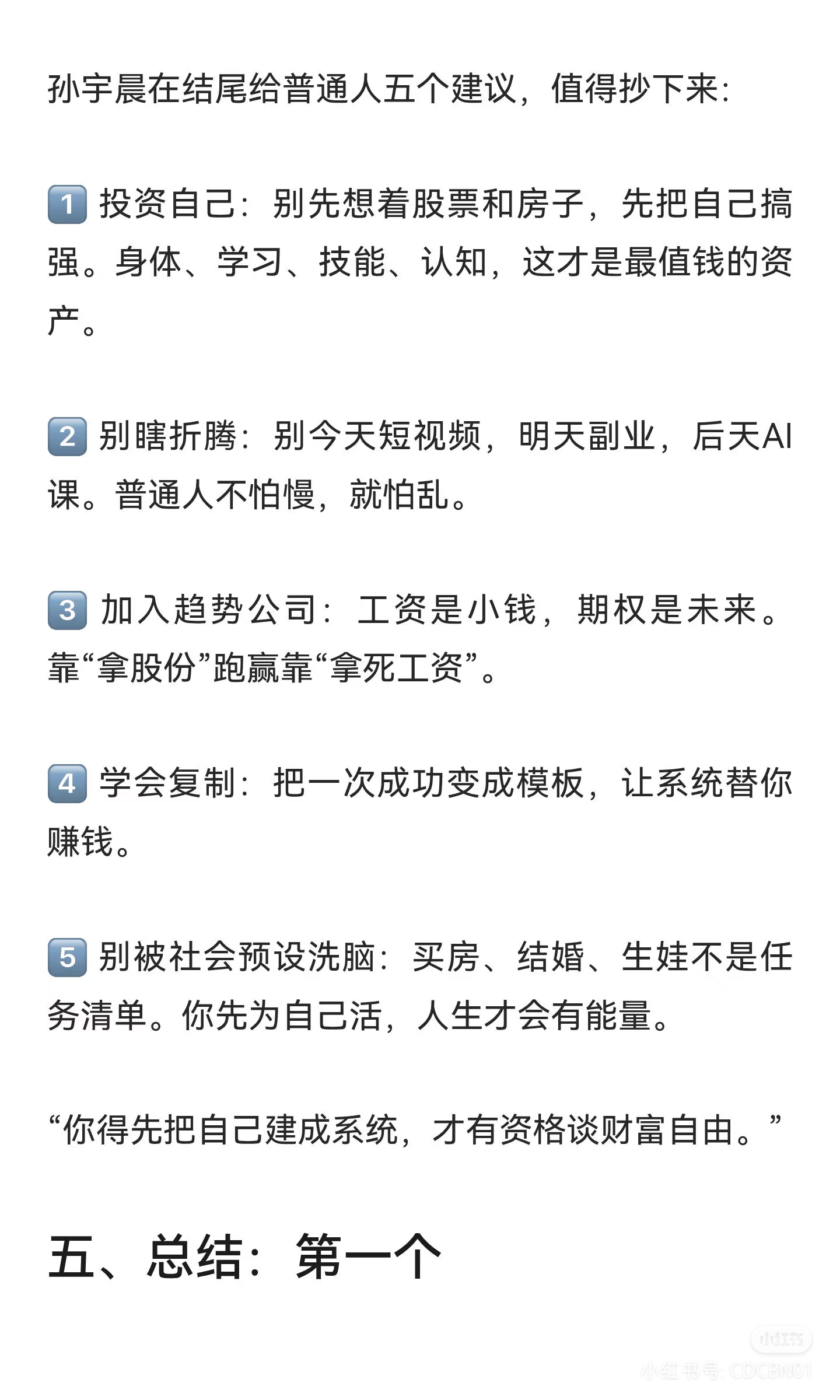 孙宇晨说,赚第一个100万的5条军规。第一,选一个即将爆发或者临近爆发的行业,这样才能吃到行业的红利。 第二,找一个高速增长的企业公司,比如以20%的速度连续增长10年。