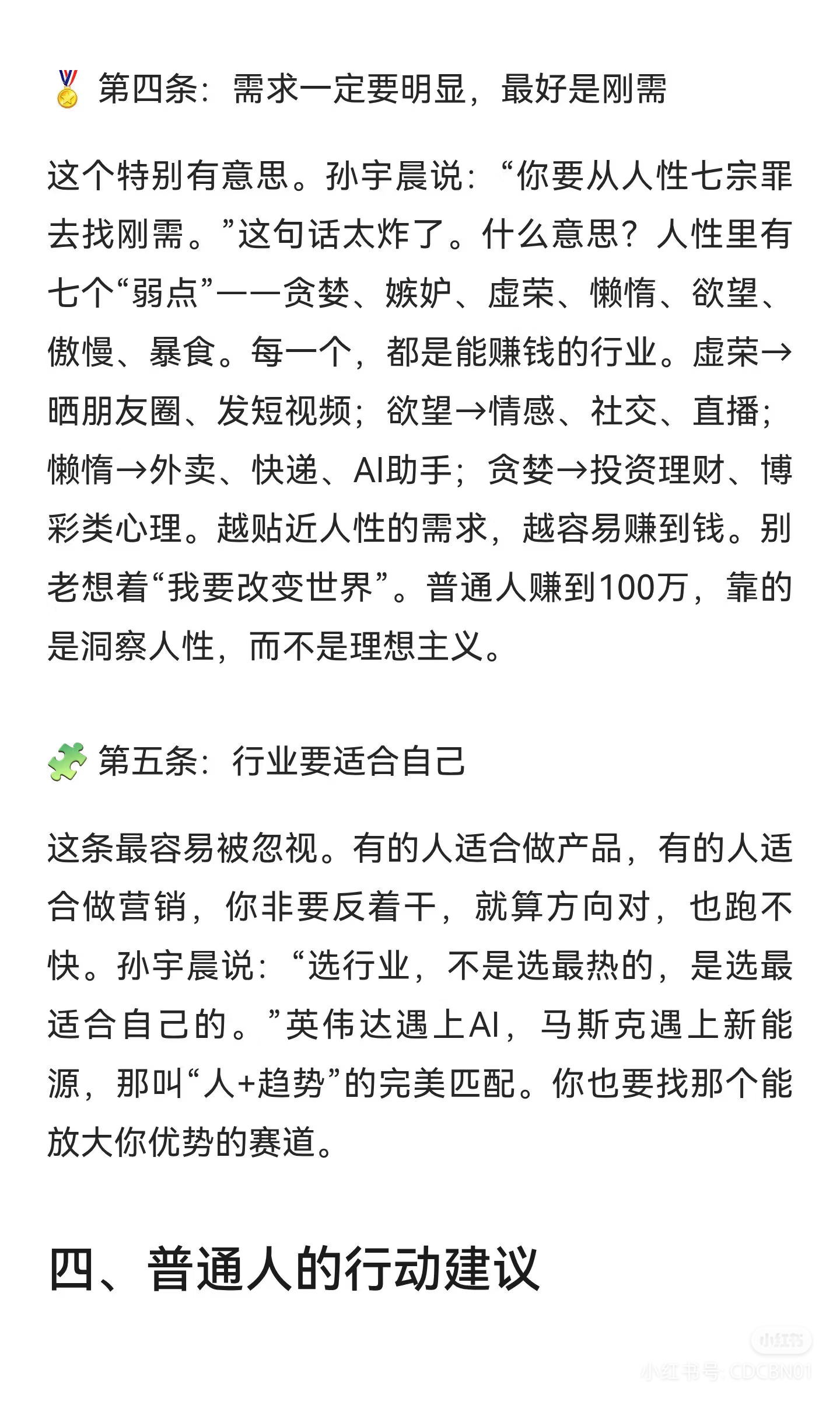 第三,要求可复制性强,扩散速度快。 第四,选择人们的刚需,刚需不仅限于吃穿住用行,而是围绕人的情绪价值,比如电影《七宗罪》里显示的人类的傲慢、嫉妒、懒惰、贪婪等都是财富机会。